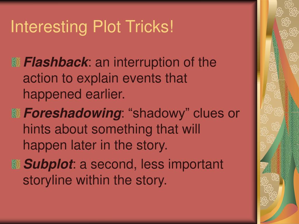 Interesting Plot Tricks! • Flashback: an interruption of the action to explain events that happened earlier. • Foreshadowing: “shadowy” clues or hints about something that will happen later in the story. • Subplot: a second, less important storyline within the story.