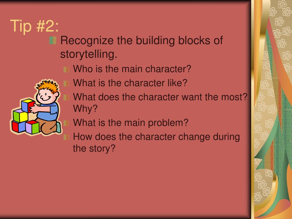 Tip #2: • Recognize the building blocks of storytelling. • Who is the main character? • What is the character like? • What does the character want the most? Why? • What is the main problem? • How does the character change during the story?