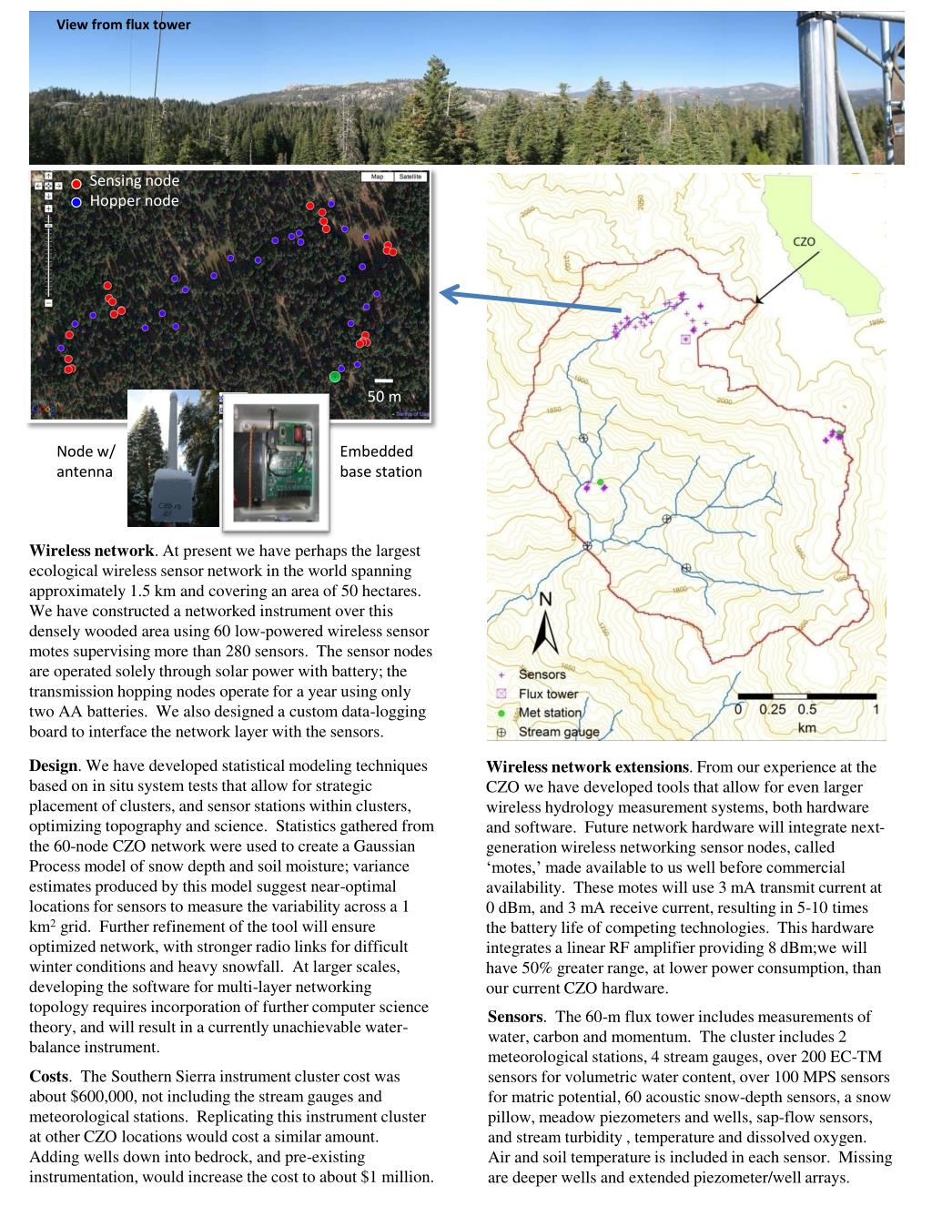 View from flux tower Wireless network. At present we have perhaps the largest ecological wireless sensor network in the world spanning approximately 1.5 km and covering an area of 50 hectares. We have constructed a networked instrument over this densely wooded area using 60 low-powered wireless sensor motes supervising more than 280 sensors. The sensor nodes are operated solely through solar power with battery; the transmission hopping nodes operate for a year using only two AA batteries. We also designed a custom data-logging board to interface the network layer with the sensors. Sensing node Hopper node Design. We have developed statistical modeling techniques based on in situ system tests that allow for strategic placement of clusters, and sensor stations within clusters, optimizing topography and science. Statistics gathered from the 60-node CZO network were used to create a Gaussian Process model of snow depth and soil moisture; variance estimates produced by this model suggest near-optimal locations for sensors to measure the variability across a 1 km2 grid. Further refinement of the tool will ensure optimized network, with stronger radio links for difficult winter conditions and heavy snowfall. At larger scales, developing the software for multi-layer networking topology requires incorporation of further computer science theory, and will result in a currently unachievable water-balance instrument. Wireless network extensions. From our experience at the CZO we have developed tools that allow for even larger wireless hydrology measurement systems, both hardware and software. Future network hardware will integrate next-generation wireless networking sensor nodes, called ‘motes,’ made available to us well before commercial availability. These motes will use 3 mA transmit current at 0 dBm, and 3 mA receive current, resulting in 5-10 times the battery life of competing technologies. This hardware integrates a linear RF amplifier providing 8 dBm;we will have 50% greater range, at lower power consumption, than our current CZO hardware. 50 m Node w/ antenna Embedded base station Sensors. The 60-m flux tower includes measurements of water, carbon and momentum. The cluster includes 2 meteorological stations, 4 stream gauges, over 200 EC-TM sensors for volumetric water content, over 100 MPS sensors for matric potential, 60 acoustic snow-depth sensors, a snow pillow, meadow piezometers and wells, sap-flow sensors, and stream turbidity , temperature and dissolved oxygen. Air and soil temperature is included in each sensor. Missing are deeper wells and extended piezometer/well arrays. Costs. The Southern Sierra instrument cluster cost was about $600,000, not including the stream gauges and meteorological stations. Replicating this instrument cluster at other CZO locations would cost a similar amount. Adding wells down into bedrock, and pre-existing instrumentation, would increase the cost to about $1 million.