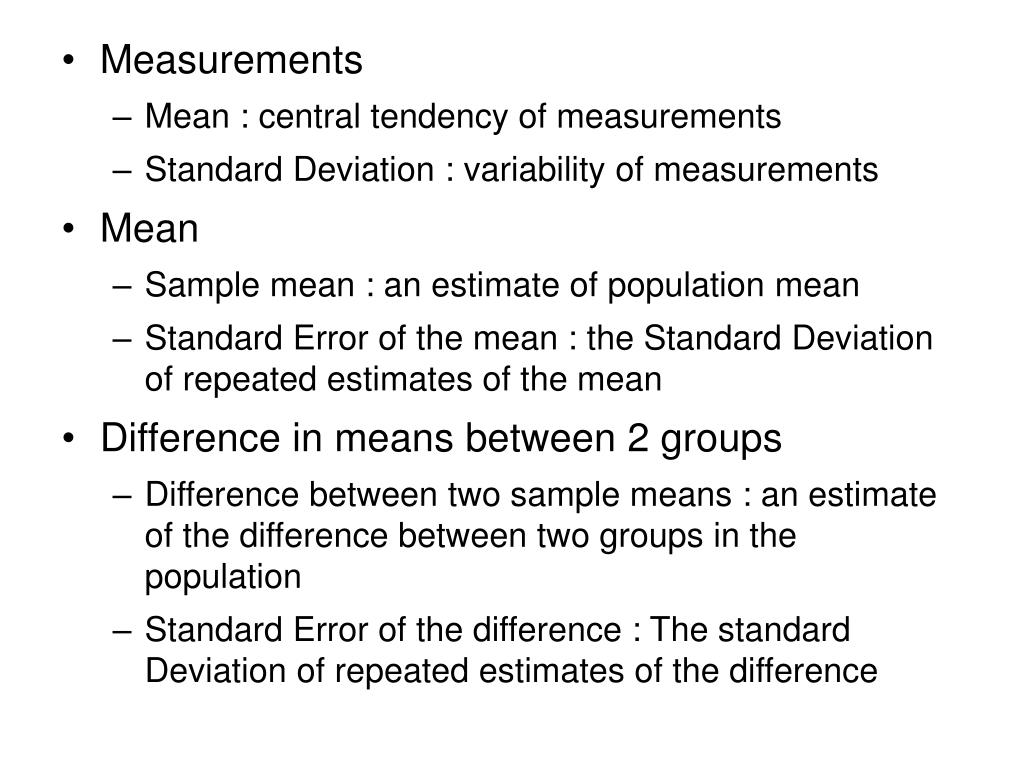 Measurements • Mean : central tendency of measurements • Standard Deviation : variability of measurements • Mean • Sample mean : an estimate of population mean • Standard Error of the mean : the Standard Deviation of repeated estimates of the mean • Difference in means between 2 groups • Difference between two sample means : an estimate of the difference between two groups in the population • Standard Error of the difference : The standard Deviation of repeated estimates of the difference