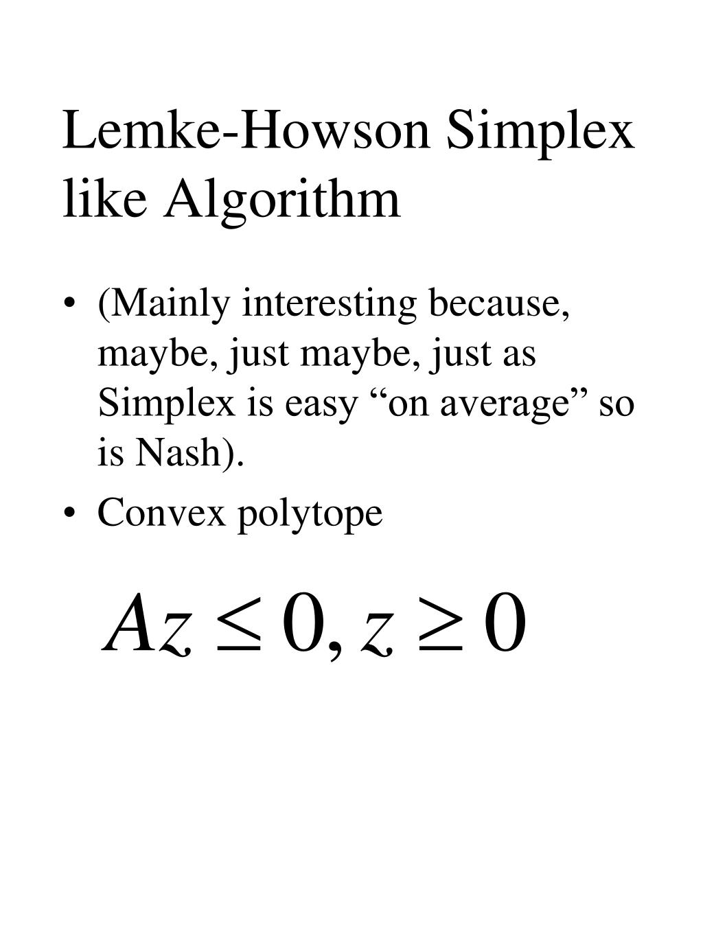 Lemke-Howson Simplex like Algorithm • (Mainly interesting because, maybe, just maybe, just as Simplex is easy “on average” so is Nash). • Convex polytope