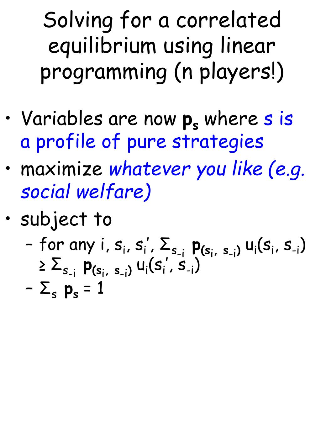 Solving for a correlated equilibrium using linear programming (n players!) Variables are now ps where s is a profile of pure strategies maximize whatever you like (e.g. social welfare) subject to for any i, si, si’, Σs-i p(si, s-i) ui(si, s-i) ≥ Σs-i p(si, s-i) ui(si’, s-i) Σs ps = 1