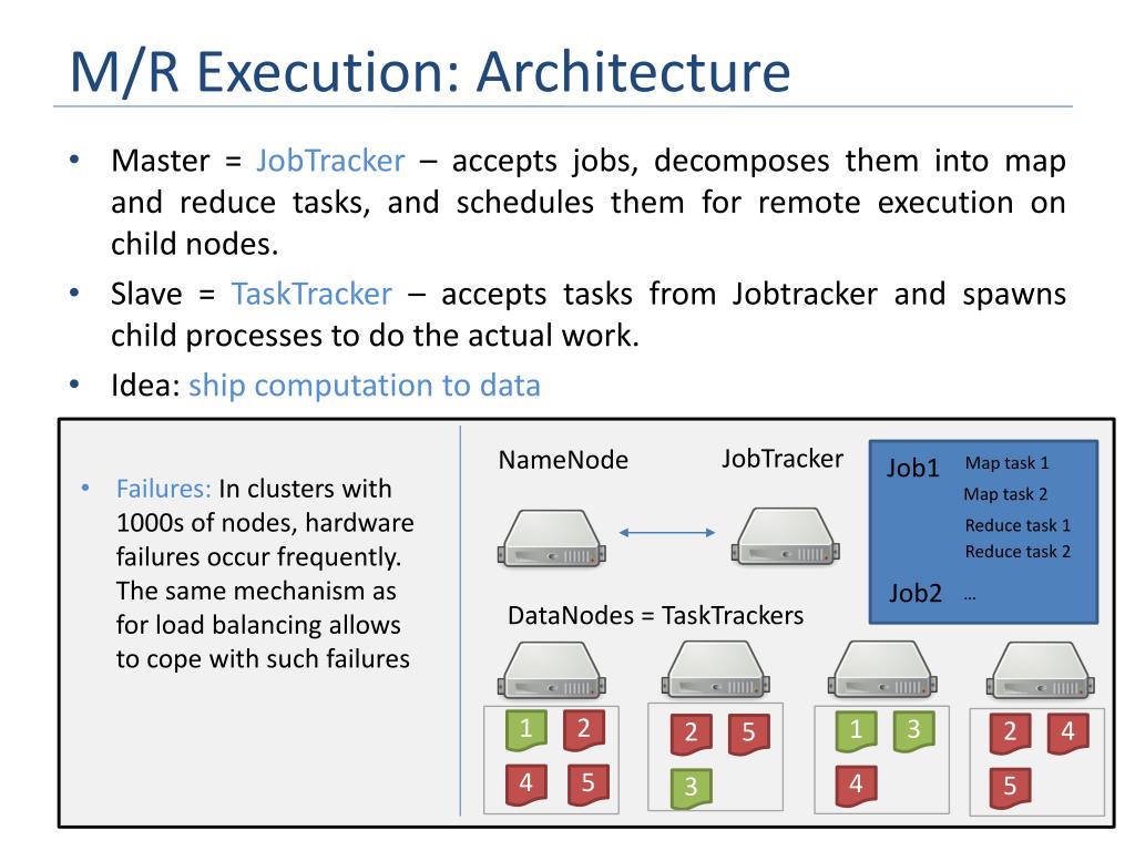 M/R Execution: Architecture • Master = JobTracker – accepts jobs, decomposes them into map and reduce tasks, and schedules them for remote execution on child nodes. • Slave = TaskTracker – accepts tasks from Jobtracker and spawns child processes to do the actual work. • Idea: ship computation to data • Failures: In clusters with 1000s of nodes, hardware failures occur frequently. The same mechanism as for load balancing allows to cope with such failures JobTracker NameNode Job1 Map task 1 Map task 2 Reduce task 1 Reduce task 2 Job2 … DataNodes = TaskTrackers 1 2 1 3 2 4 2 5 5 4 4 5 3