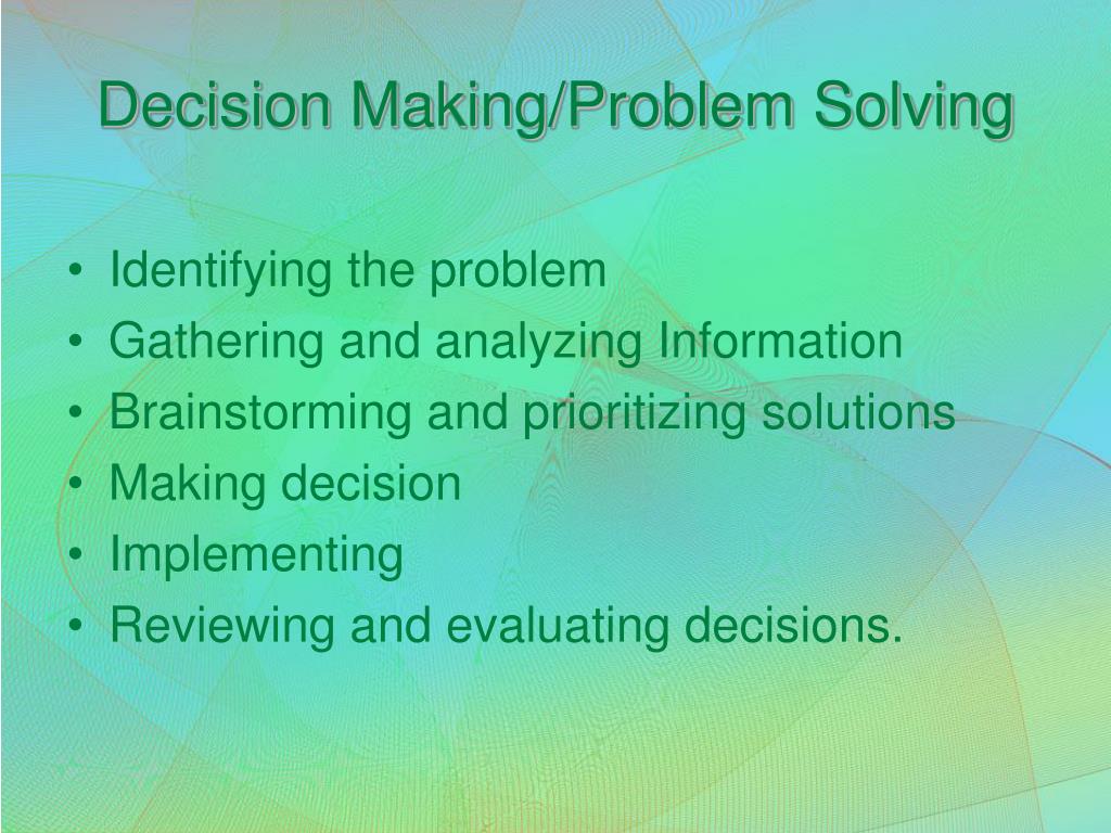 Decision Making/Problem Solving • Identifying the problem • Gathering and analyzing Information • Brainstorming and prioritizing solutions • Making decision • Implementing • Reviewing and evaluating decisions.