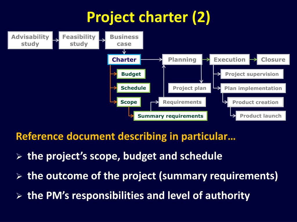 Project charter (1) Advisability study Feasibility study Business case Planning Execution Closure Charter • Reference document, also called… • project mandate • project definition • project initiation document (PID) • project overview statement (POS) • terms of reference (TOR) of the project