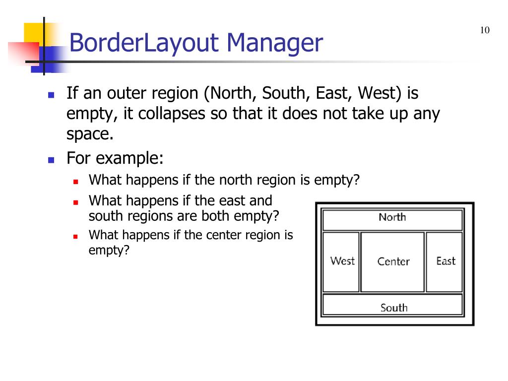 BorderLayout Manager 9 • More specifically, the sizes of the five regions are determined as shown below. West's contents determines this divider's position. East's contents determines this divider's position. North's contents determines this divider's position. South's contents determines this divider's position.