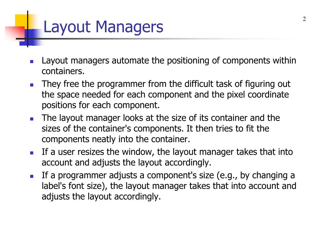 Layout Managers 2 • Layout managers automate the positioning of components within containers. • They free the programmer from the difficult task of figuring out the space needed for each component and the pixel coordinate positions for each component. • The layout manager looks at the size of its container and the sizes of the container's components. It then tries to fit the components neatly into the container. • If a user resizes the window, the layout manager takes that into account and adjusts the layout accordingly. • If a programmer adjusts a component's size (e.g., by changing a label's font size), the layout manager takes that into account and adjusts the layout accordingly.