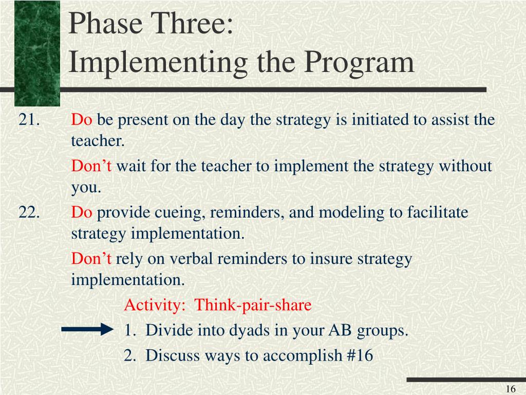 Phase Three:Implementing the Program 21. Do be present on the day the strategy is initiated to assist the teacher. Don’t wait for the teacher to implement the strategy without you. 22. Do provide cueing, reminders, and modeling to facilitate strategy implementation. Don’t rely on verbal reminders to insure strategy implementation. Activity: Think-pair-share 1. Divide into dyads in your AB groups. 2. Discuss ways to accomplish #16 23. 24.