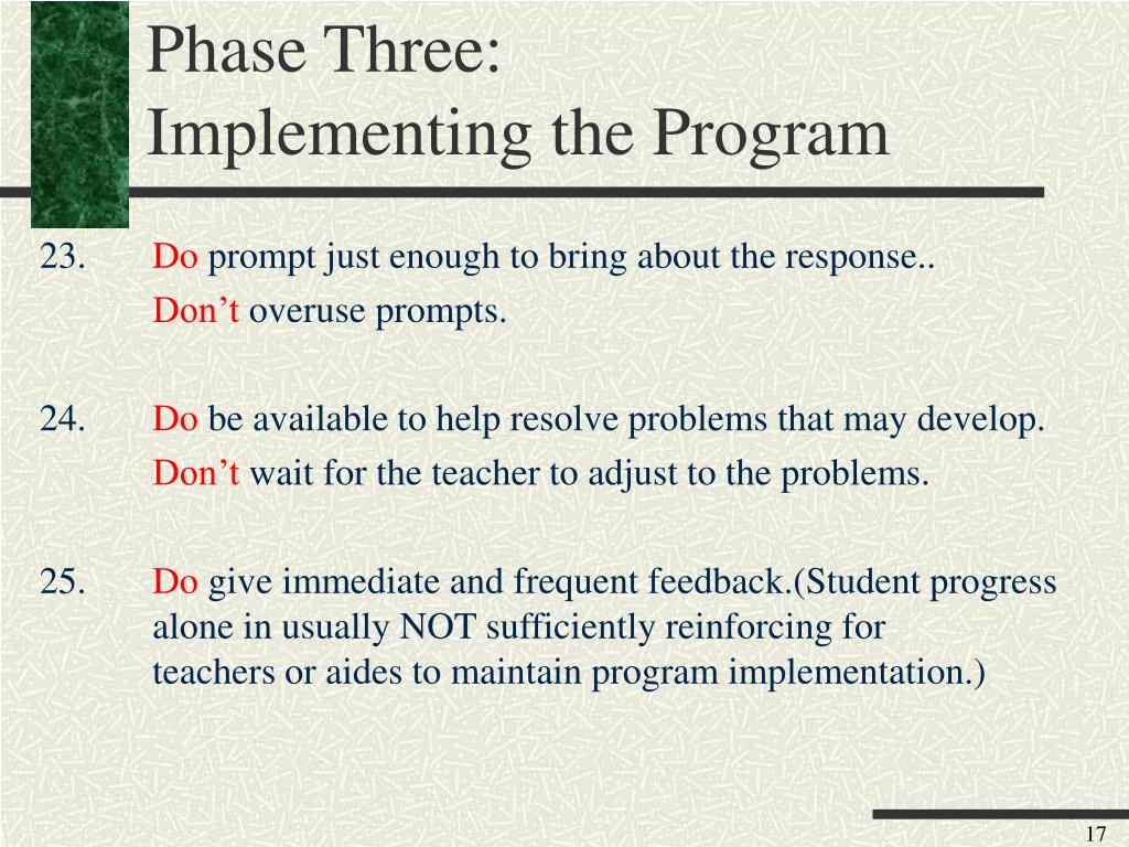 Phase Three:Implementing the Program 23. Do prompt just enough to bring about the response.. Don’t overuse prompts. 24. Do be available to help resolve problems that may develop. Don’t wait for the teacher to adjust to the problems. 25. Do give immediate and frequent feedback.(Student progress alone in usually NOT sufficiently reinforcing for teachers or aides to maintain program implementation.)