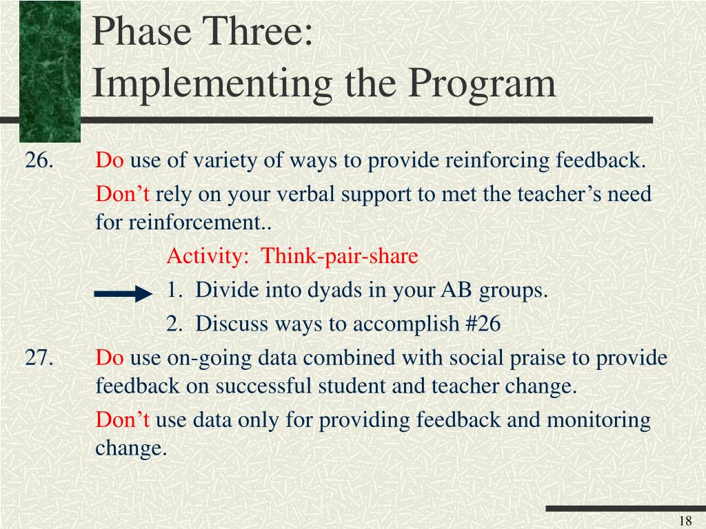Phase Three:Implementing the Program 26. Do use of variety of ways to provide reinforcing feedback. Don’t rely on your verbal support to met the teacher’s need for reinforcement.. Activity: Think-pair-share 1. Divide into dyads in your AB groups. 2. Discuss ways to accomplish #26 27. Do use on-going data combined with social praise to provide feedback on successful student and teacher change. Don’t use data only for providing feedback and monitoring change.