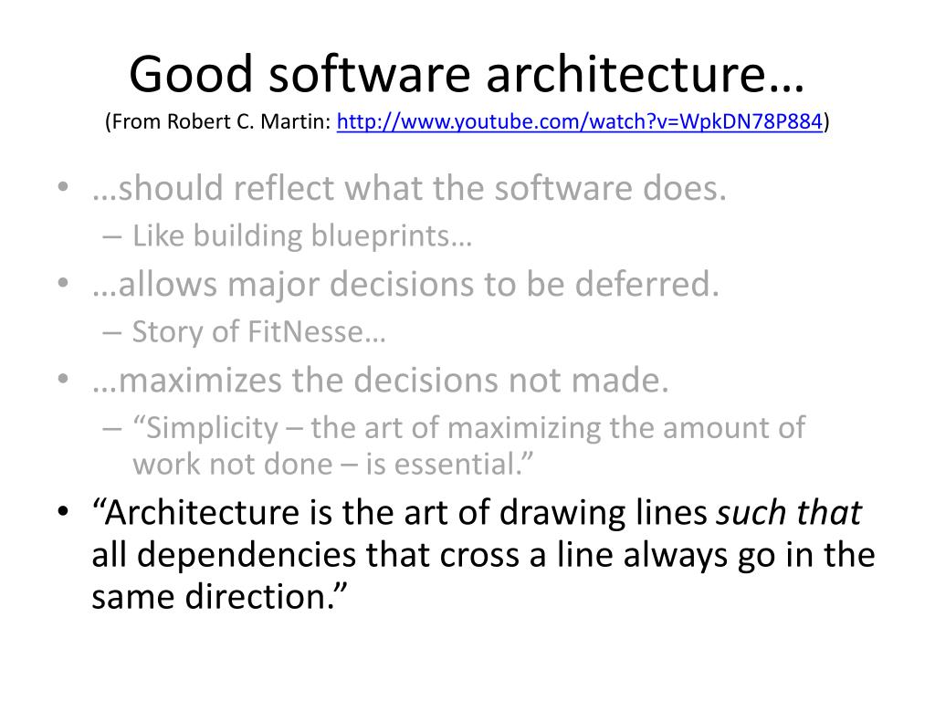 Good software architecture…(From Robert C. Martin: http://www.youtube.com/watch?v=WpkDN78P884) • …should reflect what the software does. • Like building blueprints… • …allows major decisions to be deferred. • Story of FitNesse…