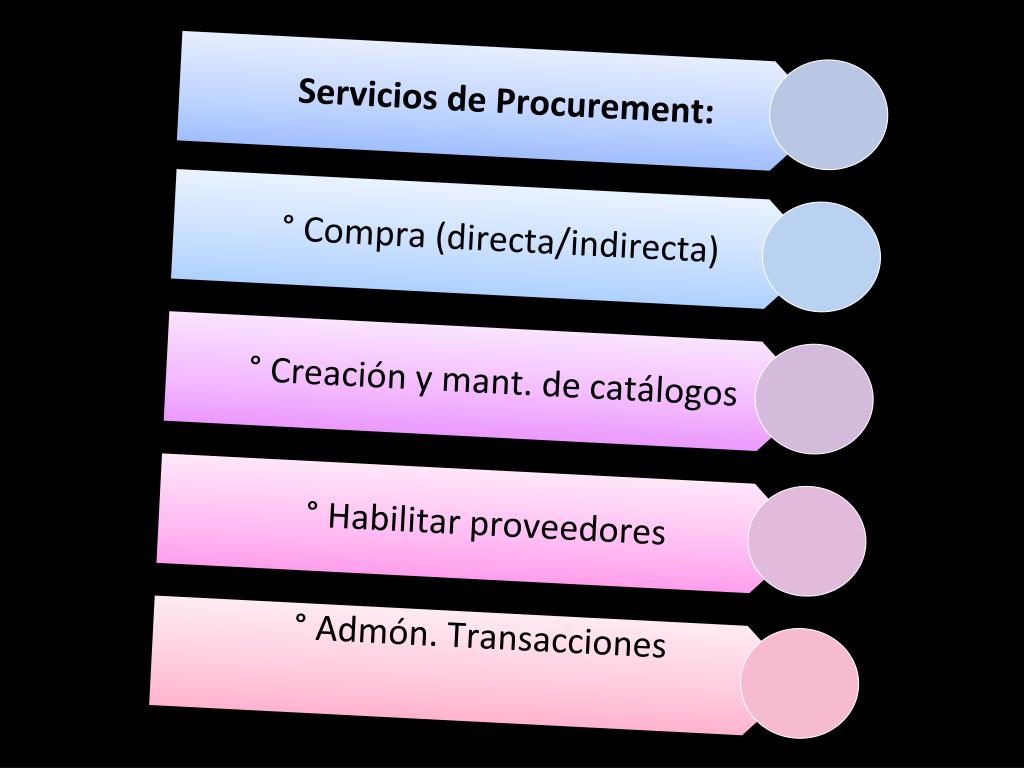 ° Admón. Transacciones ° Habilitar proveedores ° Creación y mant. de catálogos ° Compra (directa/indirecta) Servicios de Procurement: