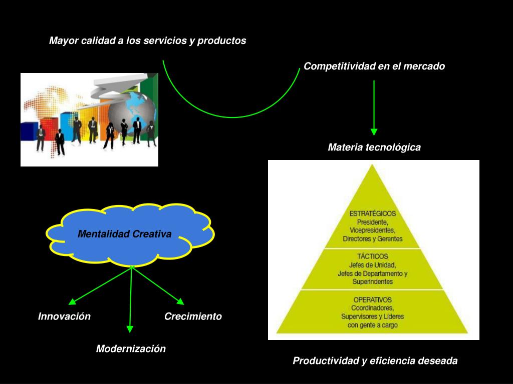 Mayor calidad a los servicios y productos Competitividad en el mercado Materia tecnológica Mentalidad Creativa Mentalidad Creativa Innovación Crecimiento Modernización Productividad y eficiencia deseada