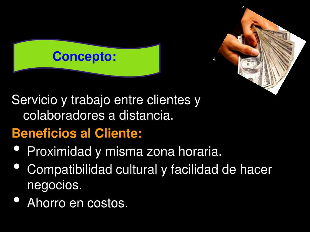 Concepto: Servicio y trabajo entre clientes y colaboradores a distancia. Beneficios al Cliente: • Proximidad y misma zona horaria. • Compatibilidad cultural y facilidad de hacer negocios. • Ahorro en costos.