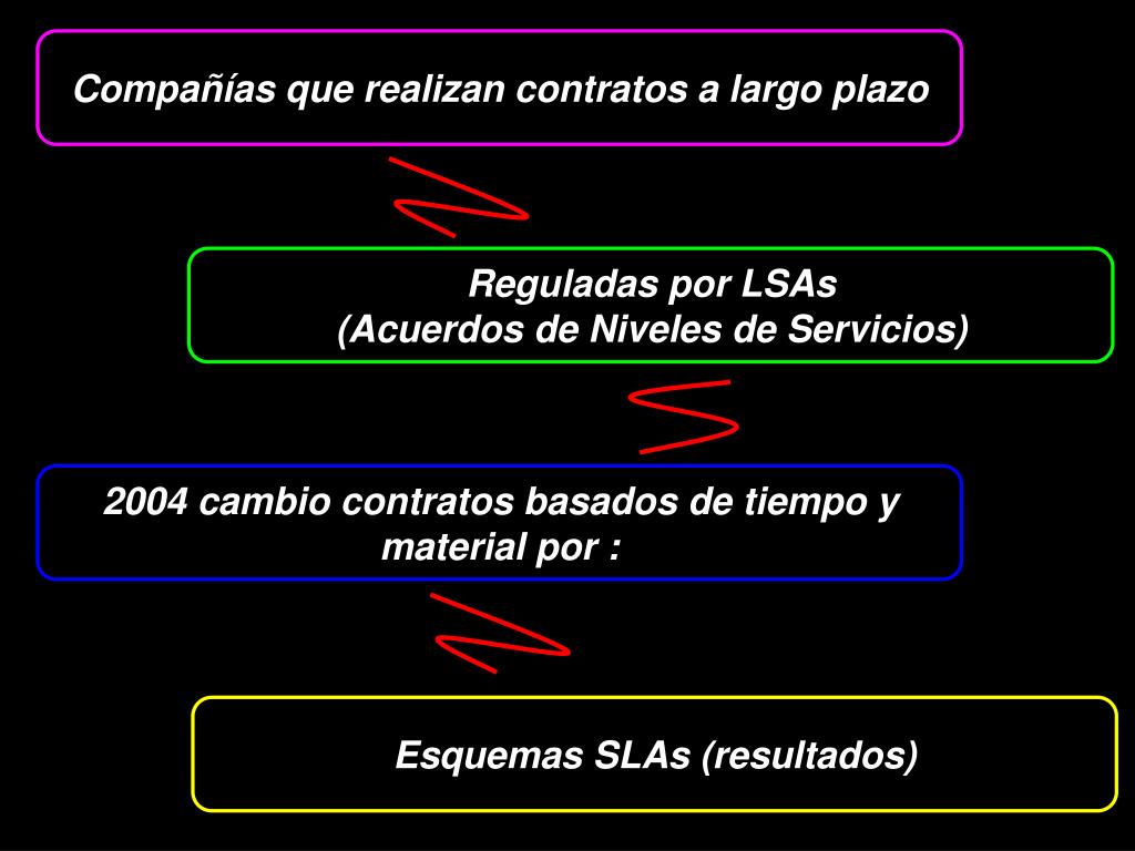 Compañías que realizan contratos a largo plazo Reguladas por LSAs (Acuerdos de Niveles de Servicios) 2004 cambio contratos basados de tiempo y material por : Esquemas SLAs (resultados)