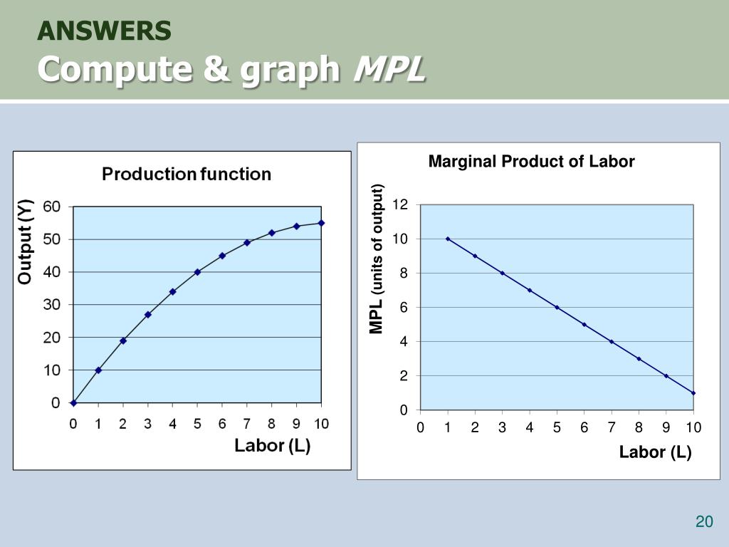 NOW YOU TRYCompute & graph MPL L YMPL 0 0 n.a. 1 10 ? 2 19 ? 3 27 8 4 34 ? 5 40 ? 6 45 ? 7 49 ? 8 52 ? 9 54 ? 10 55 ? a. Determine MPL at each value of L. b. Graph the production function. c. Graph the MPL curve with MPL on the vertical axis and L on the horizontal axis. 19