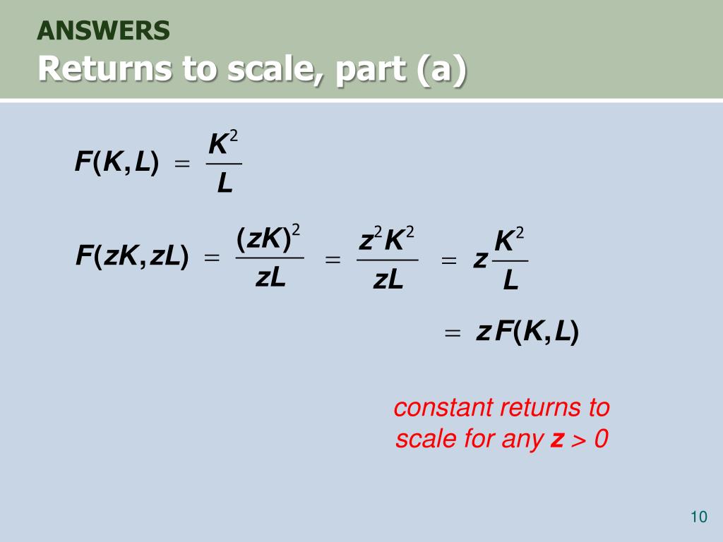 NOW YOU TRYReturns to scale • Determine whether each of these production functions has constant, decreasing, or increasing returns to scale: (a) (b) 9