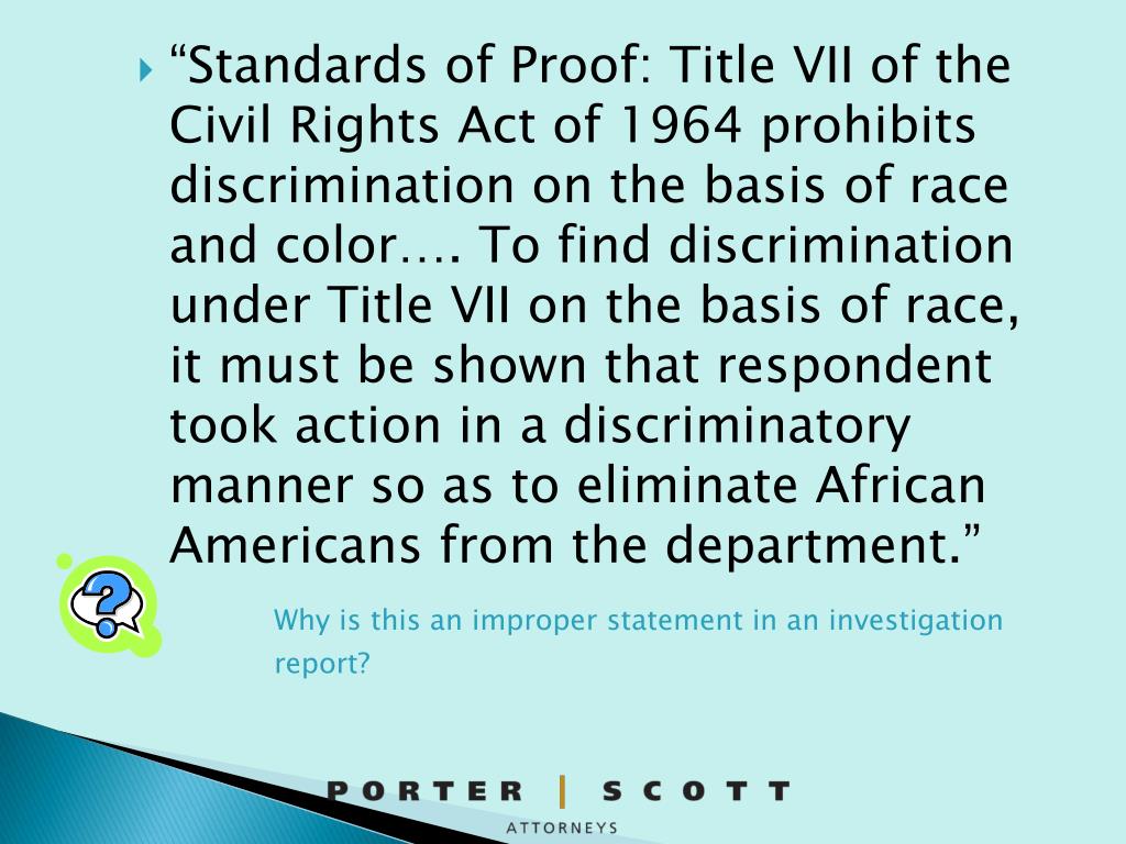 “Standards of Proof: Title VII of the Civil Rights Act of 1964 prohibits discrimination on the basis of race and color…. To find discrimination under Title VII on the basis of race, it must be shown that respondent took action in a discriminatory manner so as to eliminate African Americans from the department.” Why is this an improper statement in an investigation report?