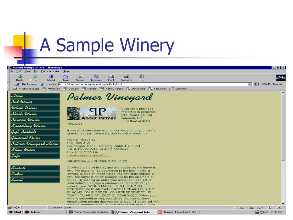 Buying wine online • Consumers sign up and enter their orders online with a winery • Purchase process: • log in • browse by wine category • select a basket of products • arrange for delivery • pay using a credit card