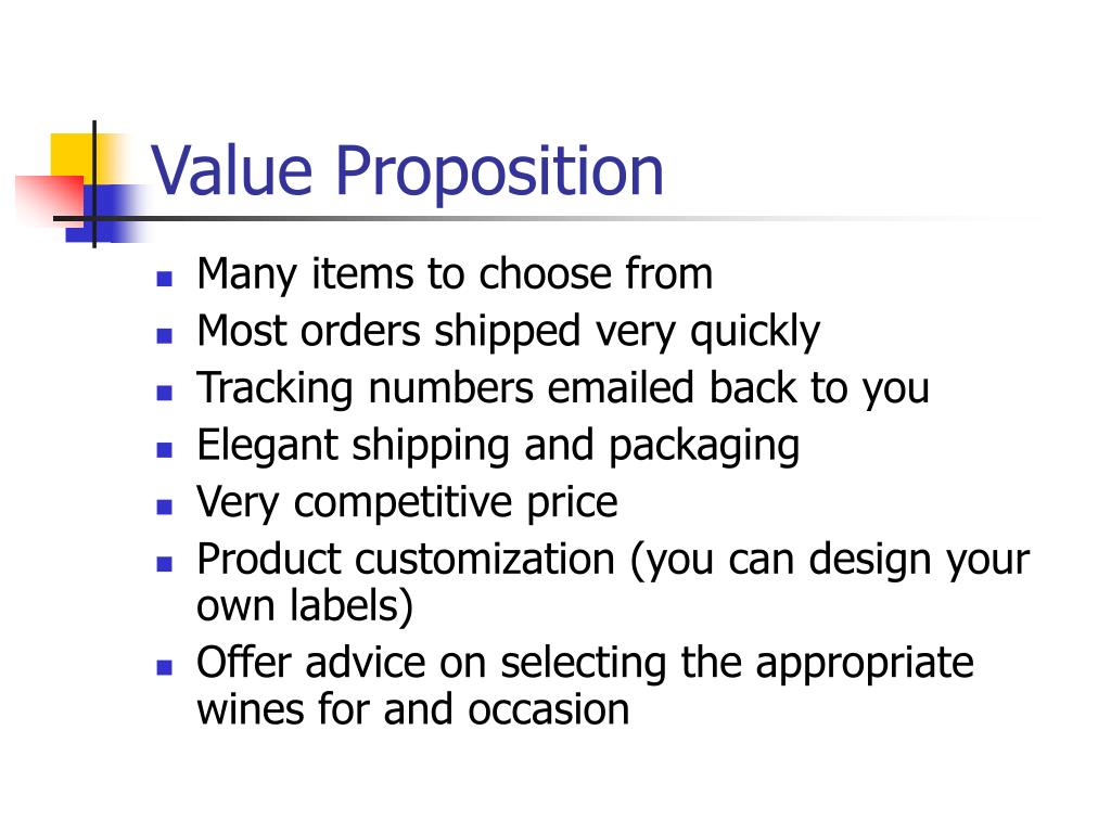 Value Proposition • Many items to choose from • Most orders shipped very quickly • Tracking numbers emailed back to you • Elegant shipping and packaging • Very competitive price • Product customization (you can design your own labels) • Offer advice on selecting the appropriate wines for and occasion