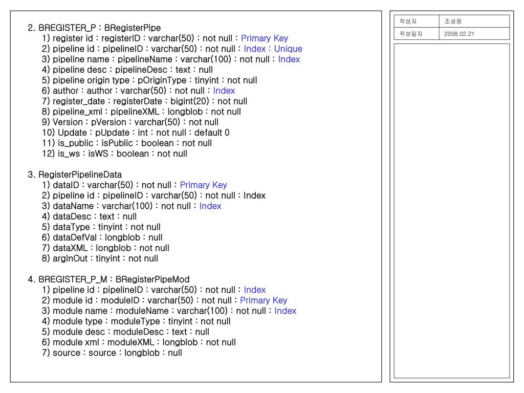 2. BREGISTER_P : BRegisterPipe 1) register id : registerID : varchar(50) : not null : Primary Key 2) pipeline id : pipelineID : varchar(50) : not null : Index : Unique 3) pipeline name : pipelineName : varchar(100) : not null : Index 4) pipeline desc : pipelineDesc : text : null 5) pipeline origin type : pOriginType : tinyint : not null 6) author : author : varchar(50) : not null : Index 7) register_date : registerDate : bigint(20) : not null 8) pipeline_xml : pipelineXML : longblob : not null 9) Version : pVersion : varchar(50) : not null 10) Update : pUpdate : int : not null : default 0 11) is_public : isPublic : boolean : not null 12) is_ws : isWS : boolean : not null 3. RegisterPipelineData 1) dataID : varchar(50) : not null : Primary Key 2) pipeline id : pipelineID : varchar(50) : not null : Index 3) dataName : varchar(100) : not null : Index 4) dataDesc : text : null 5) dataType : tinyint : not null 6) dataDefVal : longblob : null 7) dataXML : longblob : not null 8) argInOut : tinyint : not null 4. BREGISTER_P_M : BRegisterPipeMod 1) pipeline id : pipelineID : varchar(50) : not null : Index 2) module id : moduleID : varchar(50) : not null : Primary Key 3) module name : moduleName : varchar(100) : not null : Index 4) module type : moduleType : tinyint : not null 5) module desc : moduleDesc : text : null 6) module xml : moduleXML : longblob : not null 7) source : source : longblob : null