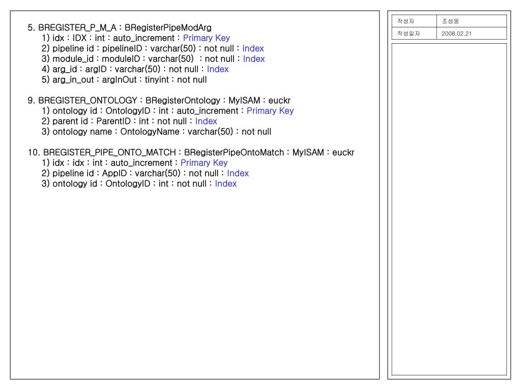 5. BREGISTER_P_M_A : BRegisterPipeModArg 1) idx : IDX : int : auto_increment : Primary Key 2) pipeline id : pipelineID : varchar(50) : not null : index 3) module_id : moduleID : varchar(50) : not null : Index 4) arg_id : argID : varchar(50) : not null : Index 5) arg_in_out : argInOut : tinyint : not null 9. BREGISTER_ONTOLOGY : BRegisterOntology : MyISAM : euckr 1) ontology id : OntologyID : int : auto_increment : Primary Key 2) parent id : ParentID : int : not null : Index 3) ontology name : OntologyName : varchar(50) : not null 10. BREGISTER_PIPE_ONTO_MATCH : BRegisterPipeOntoMatch : MyISAM : euckr 1) idx : idx : int : auto_increment : Primary Key 2) pipeline id : AppID : varchar(50) : not null : Index 3) ontology id : OntologyID : int : not null : Index