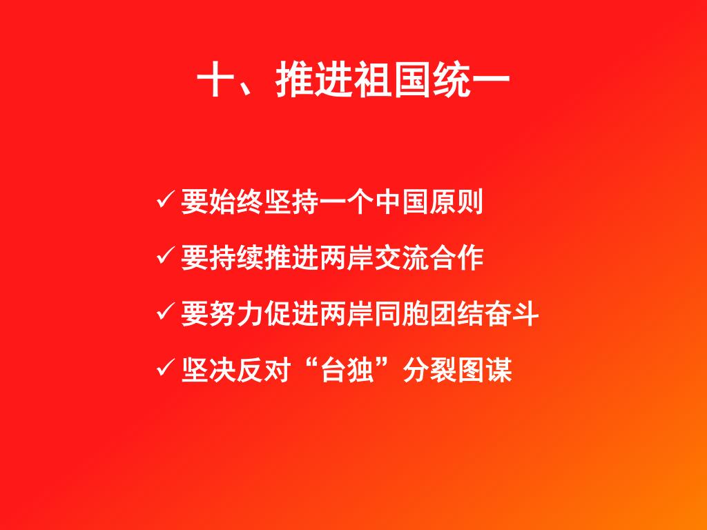 十、推进祖国统一 • 要始终坚持一个中国原则 • 要持续推进两岸交流合作 • 要努力促进两岸同胞团结奋斗 • 坚决反对“台独”分裂图谋