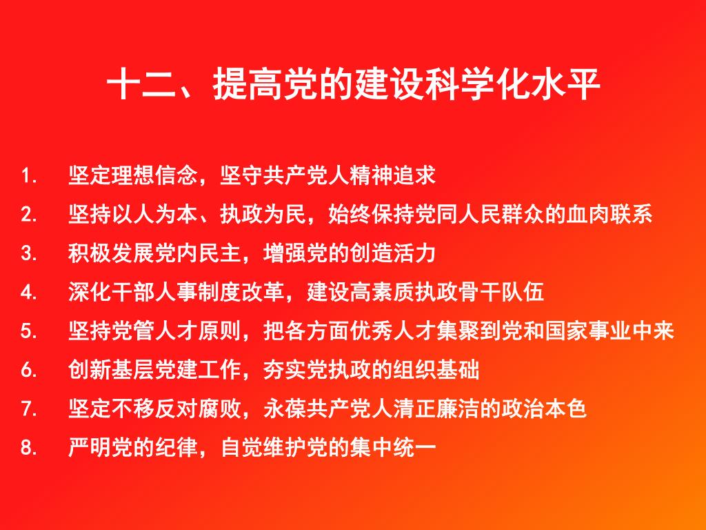 十二、提高党的建设科学化水平 • 坚定理想信念,坚守共产党人精神追求 • 坚持以人为本、执政为民,始终保持党同人民群众的血肉联系 • 积极发展党内民主,增强党的创造活力 • 深化干部人事制度改革,建设高素质执政骨干队伍 • 坚持党管人才原则,把各方面优秀人才集聚到党和国家事业中来 • 创新基层党建工作,夯实党执政的组织基础 • 坚定不移反对腐败,永葆共产党人清正廉洁的政治本色 • 严明党的纪律,自觉维护党的集中统一