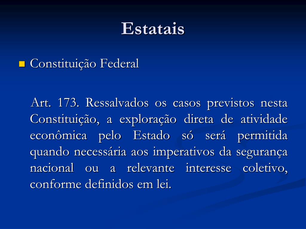 Estatais • Constituição Federal Art. 173. Ressalvados os casos previstos nesta Constituição, a exploração direta de atividade econômica pelo Estado só será permitida quando necessária aos imperativos da segurança nacional ou a relevante interesse coletivo, conforme definidos em lei.