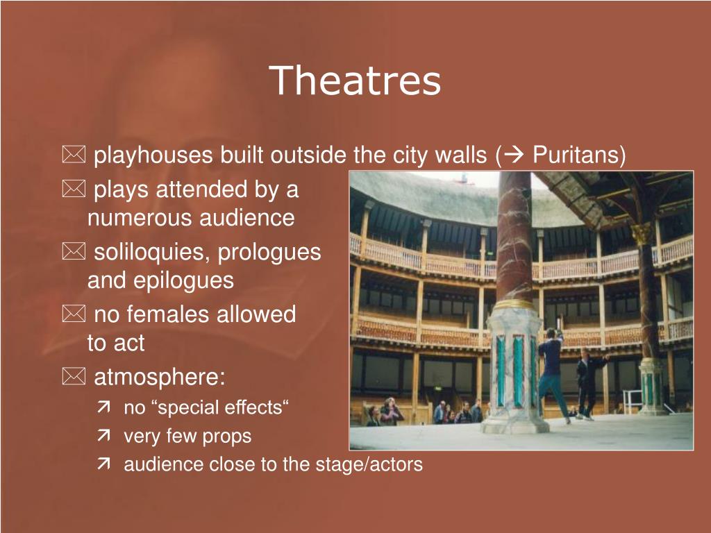 Theatres • playhouses built outside the city walls ( Puritans) • plays attended by anumerous audience • soliloquies, prologuesand epilogues • no females allowedto act • atmosphere: • no “special effects“ • very few props • audience close to the stage/actors