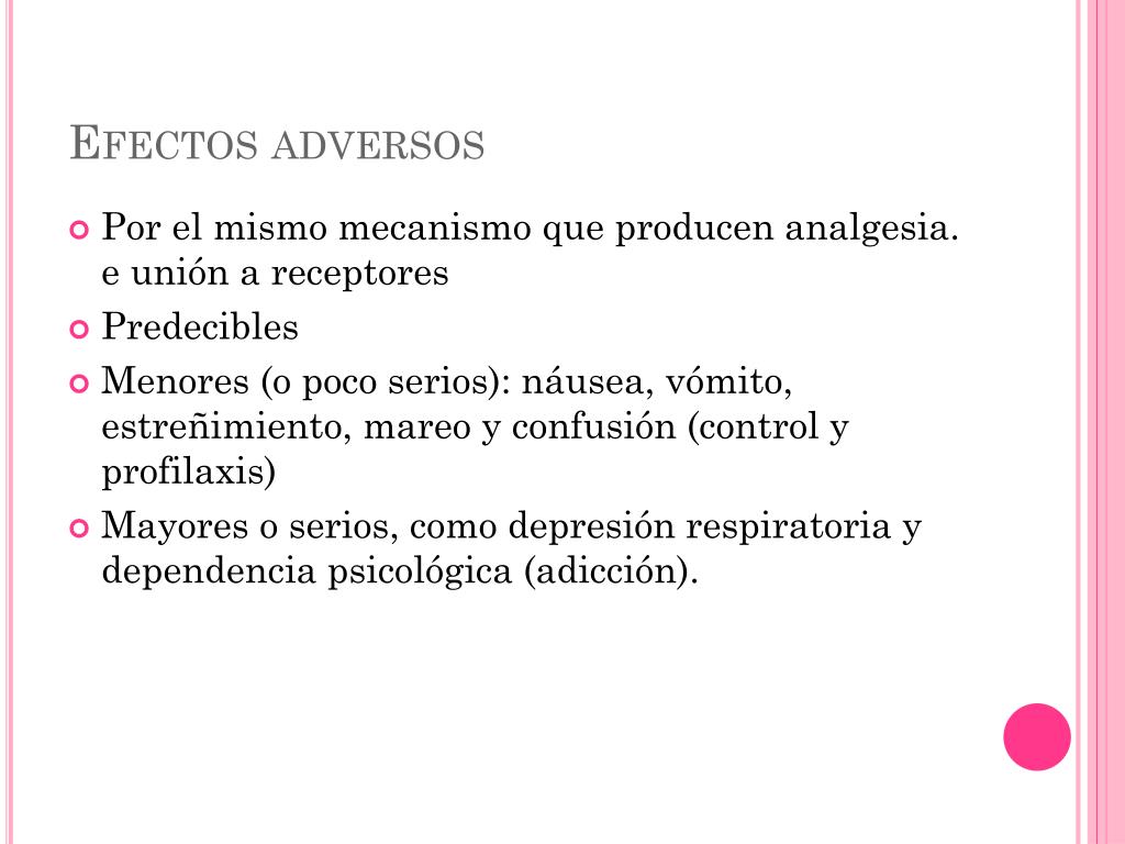 Efectos adversos • Por el mismo mecanismo que producen analgesia. e unión a receptores • Predecibles • Menores (o poco serios): náusea, vómito, estreñimiento, mareo y confusión (control y profilaxis) • Mayores o serios, como depresión respiratoria y dependencia psicológica (adicción).