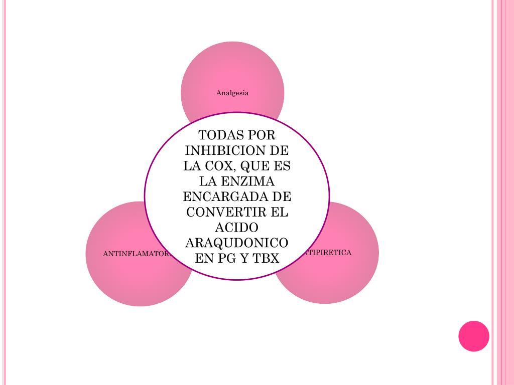 ANALGESIA Analgesia a nivel periférico, mediante la inhibición de la síntesis de las PG producidas en respuesta a una agresión o lesión tisular. Impiden que los eicosanoides contribuyan, con su acción sensibilizadora sobre las terminaciones nerviosas nociceptivas.