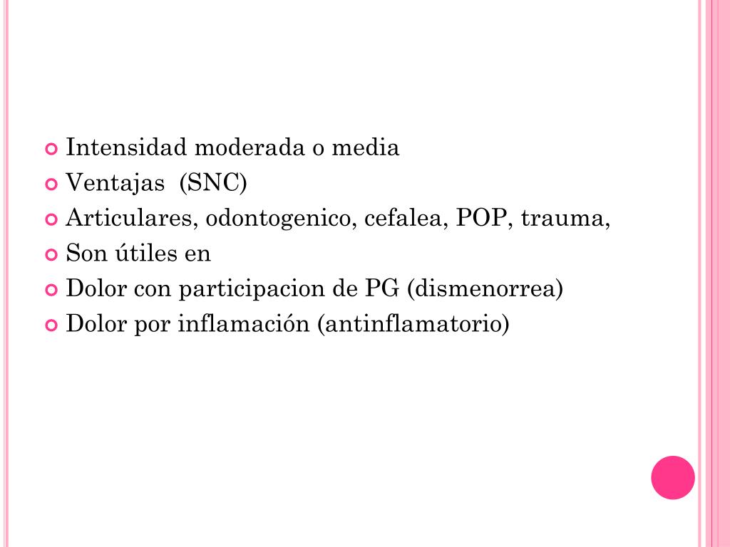 Intensidad moderada o media • Ventajas (SNC) • Articulares, odontogenico, cefalea, POP, trauma, • Son útiles en • Dolor con participacion de PG (dismenorrea) • Dolor por inflamación (antinflamatorio)