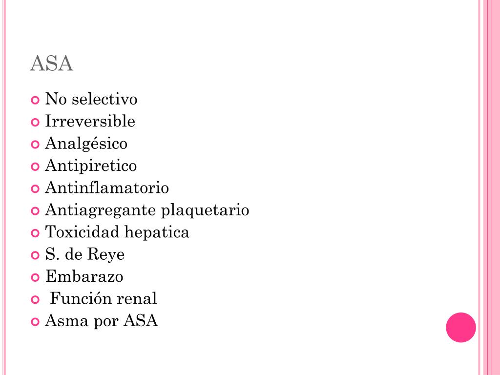ASA • No selectivo • Irreversible • Analgésico • Antipiretico • Antinflamatorio • Antiagreganteplaquetario • Toxicidad hepatica • S. de Reye • Embarazo • Función renal • Asma por ASA