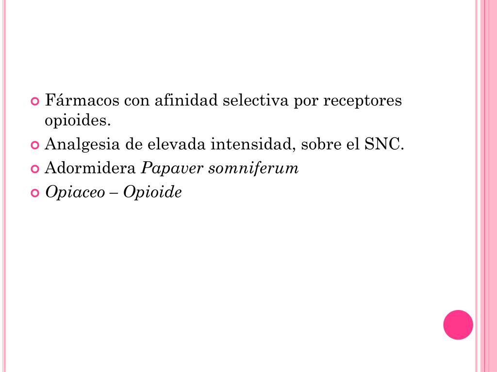 Fármacos con afinidad selectiva por receptores opioides. • Analgesia de elevada intensidad, sobre el SNC. • Adormidera Papaversomniferum • Opiaceo – Opioide