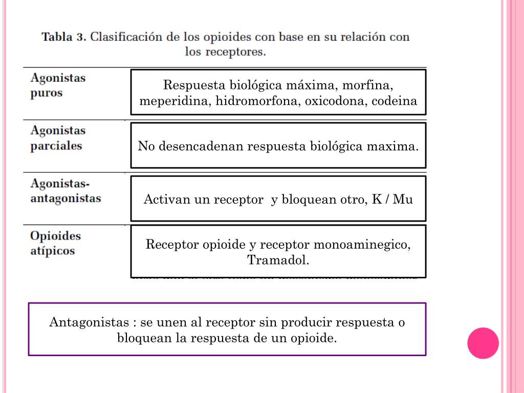 Respuesta biológica máxima, morfina, meperidina, hidromorfona, oxicodona, codeina No desencadenan respuesta biológica maxima. Activan un receptor y bloquean otro, K / Mu Receptor opioide y receptor monoaminegico, Tramadol. Antagonistas : se unen al receptor sin producir respuesta o bloquean la respuesta de un opioide.
