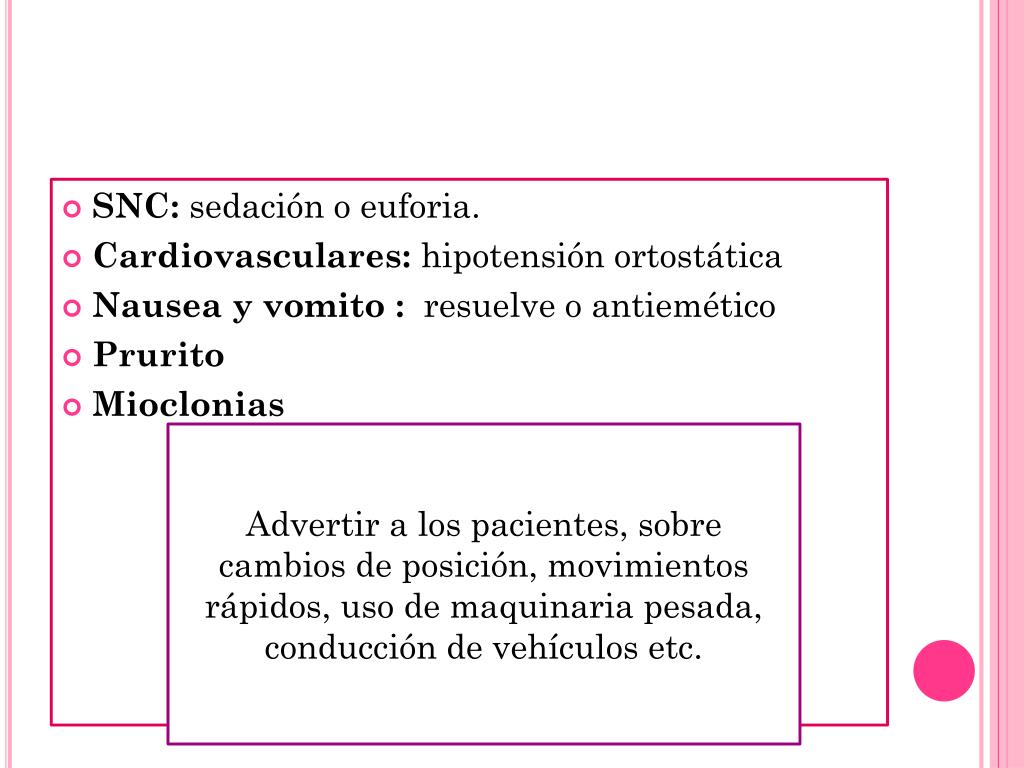 SNC: sedación o euforia. • Cardiovasculares: hipotensión ortostática • Nausea y vomito : resuelve o antiemético • Prurito • Mioclonias Advertir a los pacientes, sobre cambios de posición, movimientos rápidos, uso de maquinaria pesada, conducción de vehículos etc.