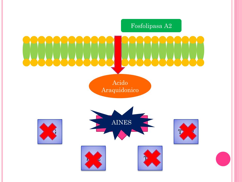 Fosfolipasa A2 Acido Araquidonico AINES Ciclooxigenasa 1 /2 PGG TXA2 PGI2 TBX