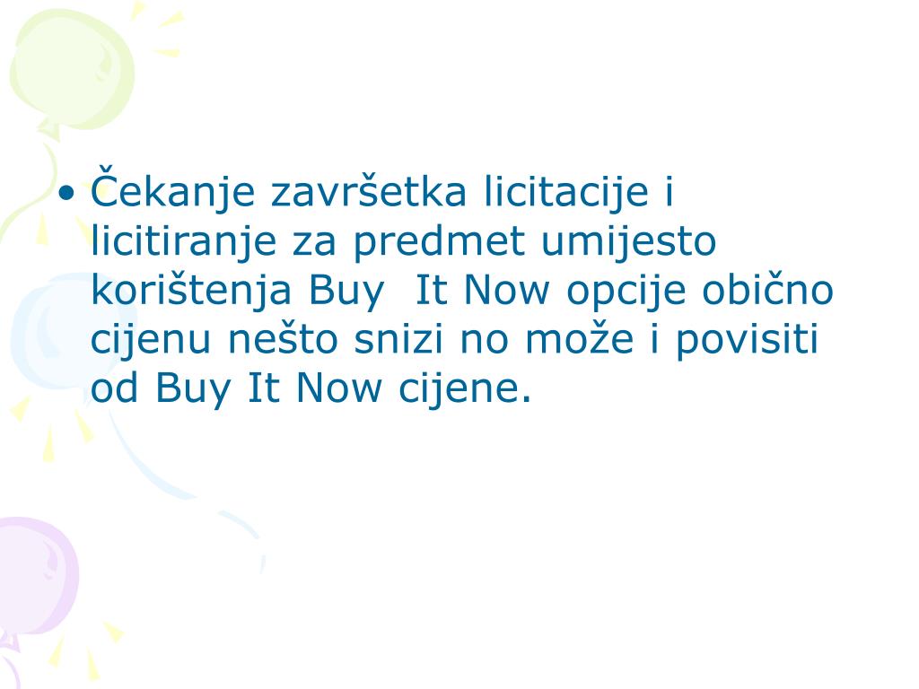 Koja je razlika između predmeta s "buy it now" i bez "buy it now" opcije? • Kod buy it now predmeta, ne morate čekati da prođe licitacija već ga možete kupiti odmah (po nešto višoj cijeni uglavnom) - to je kao da dođete u dućan i kupite. Dakle, buy it now je fiksna cijena, licitiranje nije nužno.