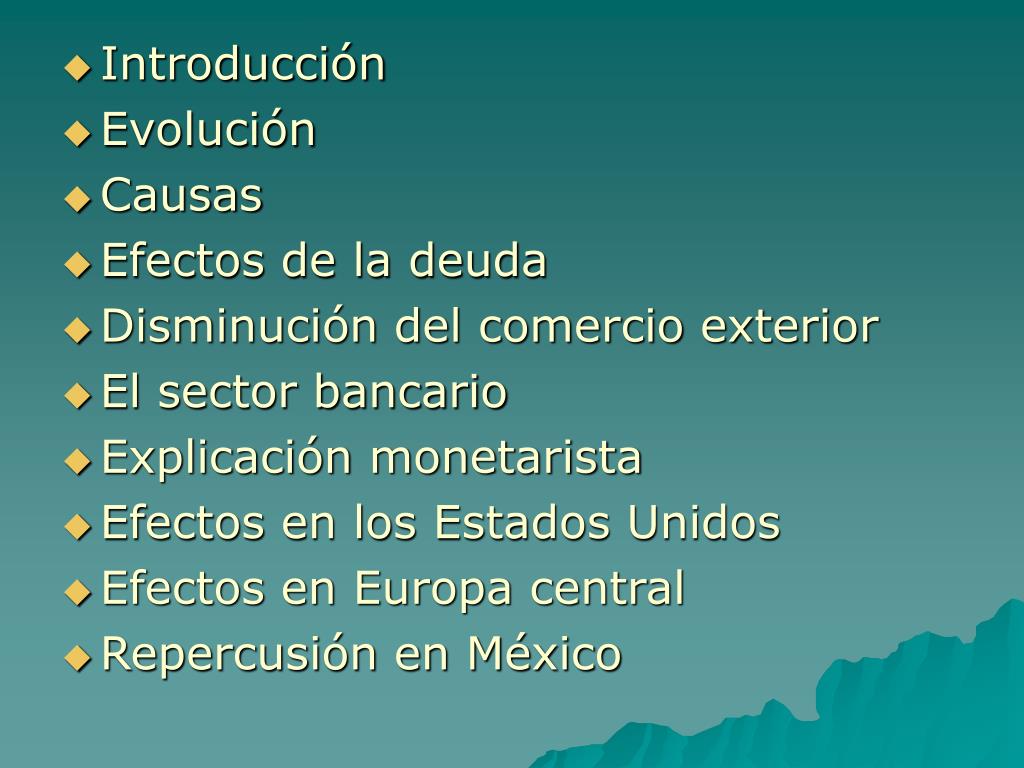 Introducción • Evolución • Causas • Efectos de la deuda • Disminución del comercio exterior • El sector bancario • Explicación monetarista • Efectos en los Estados Unidos • Efectos en Europa central • Repercusión en México