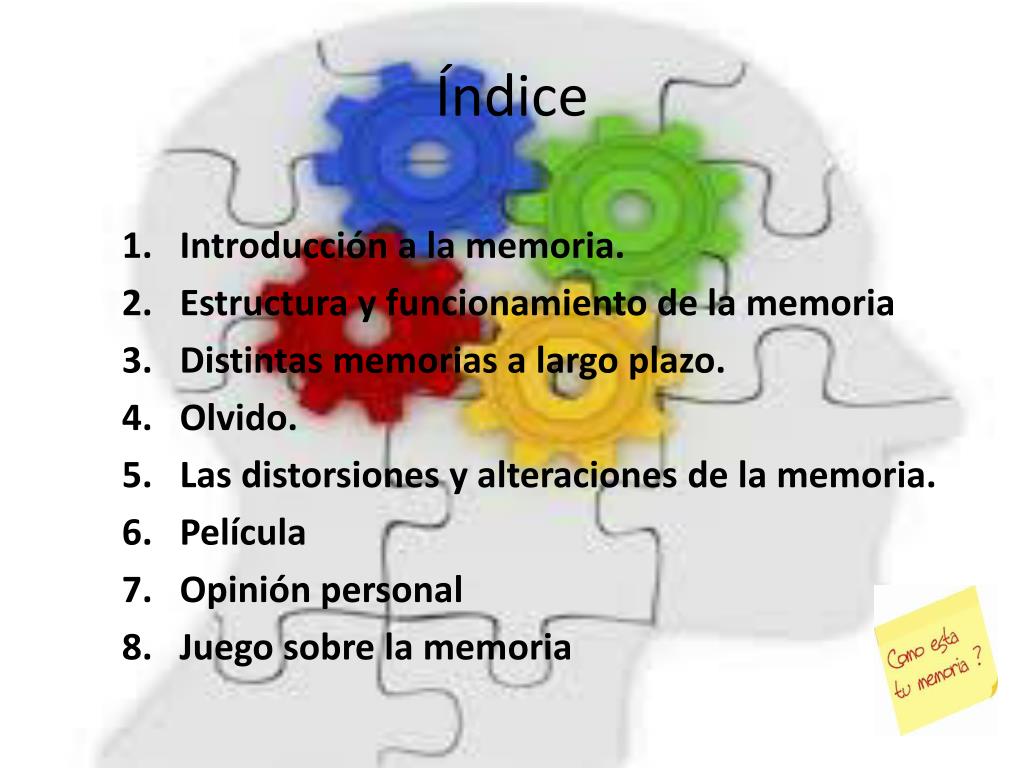 Índice • Introducción a la memoria. • Estructura y funcionamiento de la memoria • Distintas memorias a largo plazo. • Olvido. • Las distorsiones y alteraciones de la memoria. • Película • Opinión personal • Juego sobre la memoria