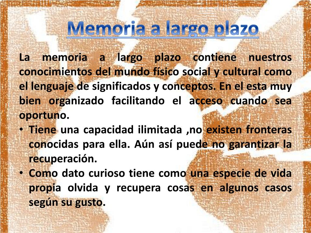 Memoria a largo plazo • La memoria a largo plazo contiene nuestros conocimientos del mundo físico social y cultural como el lenguaje de significados y conceptos. En el esta muy bien organizado facilitando el acceso cuando sea oportuno. • Tiene una capacidad ilimitada ,no existen fronteras conocidas para ella. Aún así puede no garantizar la recuperación. • Como dato curioso tiene como una especie de vida propia olvida y recupera cosas en algunos casos según su gusto.