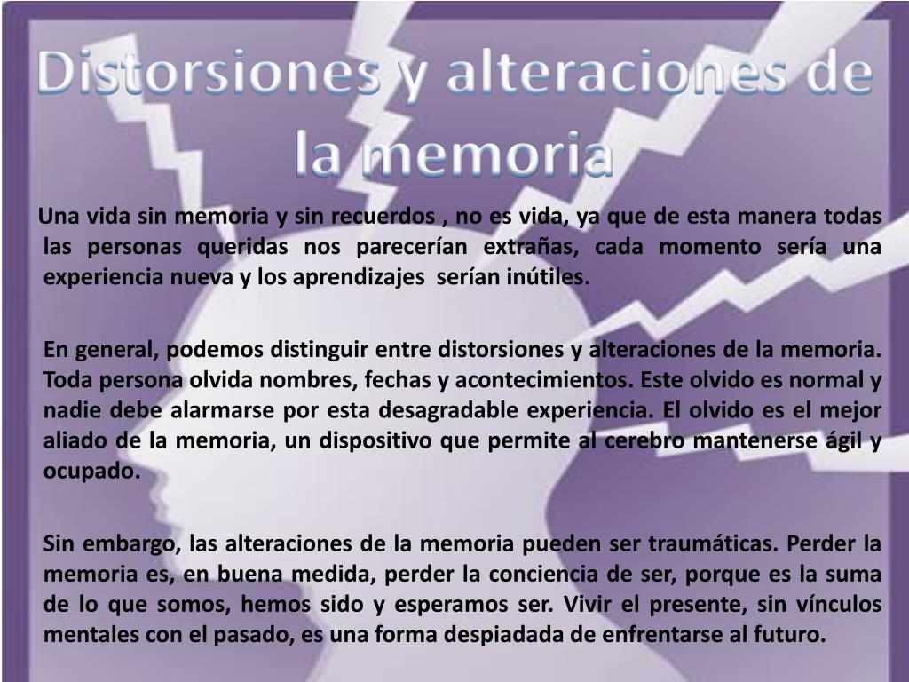 Distorsiones y alteraciones de la memoria Una vida sin memoria y sin recuerdos , no es vida, ya que de esta manera todas las personas queridas nos parecerían extrañas, cada momento sería una experiencia nueva y los aprendizajes serían inútiles. En general, podemos distinguir entre distorsiones y alteraciones de la memoria. Toda persona olvida nombres, fechas y acontecimientos. Este olvido es normal y nadie debe alarmarse por esta desagradable experiencia. El olvido es el mejor aliado de la memoria, un dispositivo que permite al cerebro mantenerse ágil y ocupado. Sin embargo, las alteraciones de la memoria pueden ser traumáticas. Perder la memoria es, en buena medida, perder la conciencia de ser, porque es la suma de lo que somos, hemos sido y esperamos ser. Vivir el presente, sin vínculos mentales con el pasado, es una forma despiadada de enfrentarse al futuro.