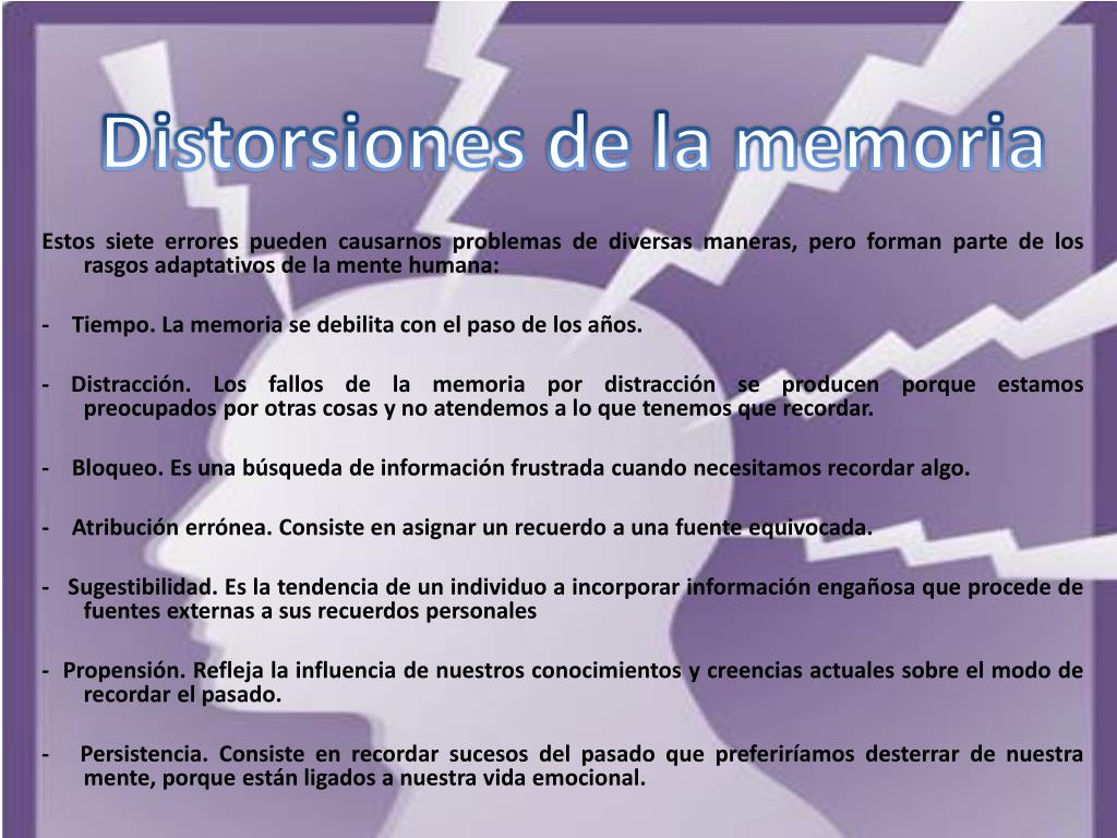 Distorsiones de la memoria Estos siete errores pueden causarnos problemas de diversas maneras, pero forman parte de los rasgos adaptativos de la mente humana: - Tiempo. La memoria se debilita con el paso de los años. - Distracción. Los fallos de la memoria por distracción se producen porque estamos preocupados por otras cosas y no atendemos a lo que tenemos que recordar. - Bloqueo. Es una búsqueda de información frustrada cuando necesitamos recordar algo. - Atribución errónea. Consiste en asignar un recuerdo a una fuente equivocada. - Sugestibilidad. Es la tendencia de un individuo a incorporar información engañosa que procede de fuentes externas a sus recuerdos personales - Propensión. Refleja la influencia de nuestros conocimientos y creencias actuales sobre el modo de recordar el pasado. - Persistencia. Consiste en recordar sucesos del pasado que preferiríamos desterrar de nuestra mente, porque están ligados a nuestra vida emocional.