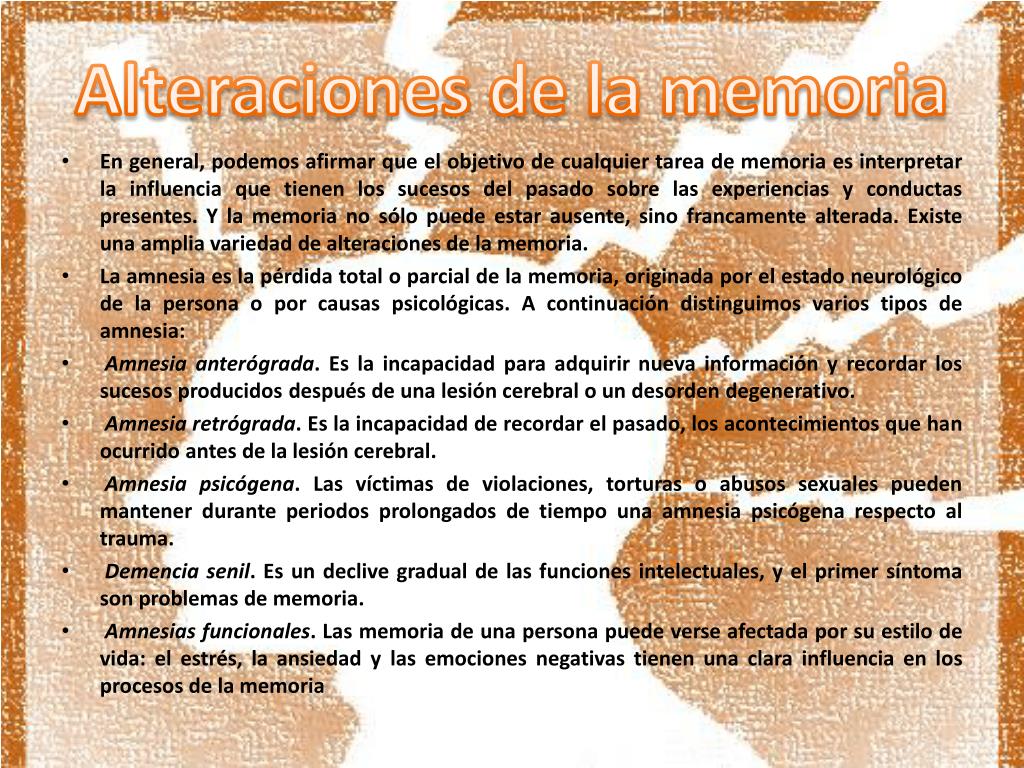 Alteraciones de la memoria • En general, podemos afirmar que el objetivo de cualquier tarea de memoria es interpretar la influencia que tienen los sucesos del pasado sobre las experiencias y conductas presentes. Y la memoria no sólo puede estar ausente, sino francamente alterada. Existe una amplia variedad de alteraciones de la memoria. • La amnesia es la pérdida total o parcial de la memoria, originada por el estado neurológico de la persona o por causas psicológicas. A continuación distinguimos varios tipos de amnesia: • Amnesia anterógrada. Es la incapacidad para adquirir nueva información y recordar los sucesos producidos después de una lesión cerebral o un desorden degenerativo. • Amnesia retrógrada. Es la incapacidad de recordar el pasado, los acontecimientos que han ocurrido antes de la lesión cerebral. • Amnesia psicógena. Las víctimas de violaciones, torturas o abusos sexuales pueden mantener durante periodos prolongados de tiempo una amnesia psicógena respecto al trauma. • Demencia senil. Es un declive gradual de las funciones intelectuales, y el primer síntoma son problemas de memoria. • Amnesias funcionales. Las memoria de una persona puede verse afectada por su estilo de vida: el estrés, la ansiedad y las emociones negativas tienen una clara influencia en los procesos de la memoria