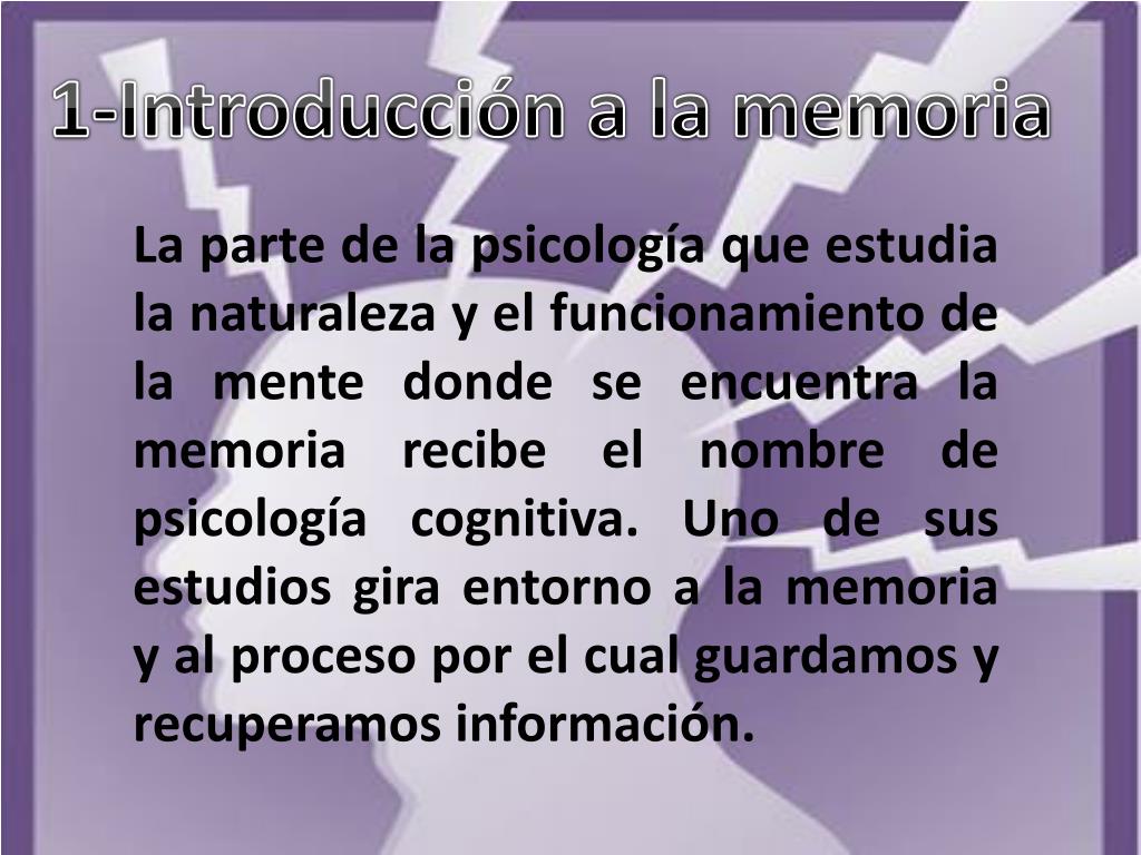 1-Introducción a la memoria La parte de la psicología que estudia la naturaleza y el funcionamiento de la mente donde se encuentra la memoria recibe el nombre de psicología cognitiva. Uno de sus estudios gira entorno a la memoria y al proceso por el cual guardamos y recuperamos información.