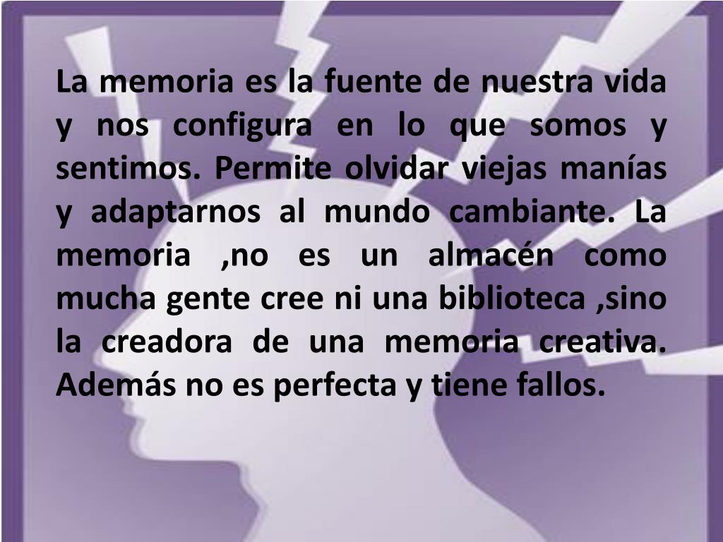 La memoria es la fuente de nuestra vida y nos configura en lo que somos y sentimos. Permite olvidar viejas manías y adaptarnos al mundo cambiante. La memoria ,no es un almacén como mucha gente cree ni una biblioteca ,sino la creadora de una memoria creativa. Además no es perfecta y tiene fallos.