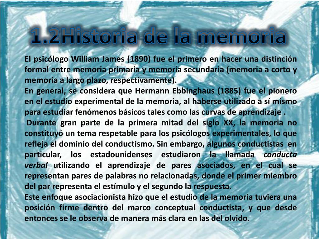 1.2Historiade la memoria El psicólogo William James (1890) fue el primero en hacer una distinción formal entre memoria primaria y memoria secundaria (memoria a corto y memoria a largo plazo, respectivamente). En general, se considera que Hermann Ebbinghaus (1885) fue el pionero en el estudio experimental de la memoria, al haberse utilizado a sí mismo para estudiar fenómenos básicos tales como las curvas de aprendizaje . Durante gran parte de la primera mitad del siglo XX, la memoria no constituyó un tema respetable para los psicólogos experimentales, lo que refleja el dominio del conductismo. Sin embargo, algunos conductistas en particular, los estadounidenses estudiaron la llamada conducta verbal utilizando el aprendizaje de pares asociados, en el cual se representan pares de palabras no relacionadas, donde el primer miembro del par representa el estímulo y el segundo la respuesta. Este enfoque asociacionista hizo que el estudio de la memoria tuviera una posición firme dentro del marco conceptual conductista, y que desde entonces se le observa de manera más clara en las del olvido.