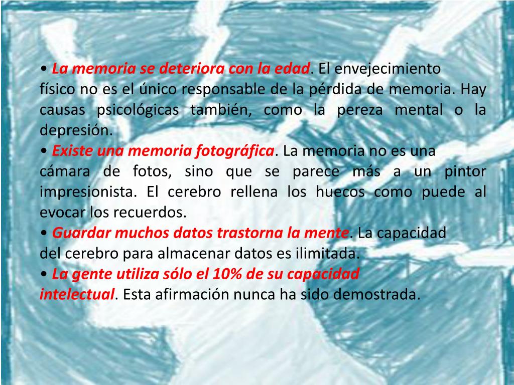 • La memoria se deteriora con la edad. El envejecimiento físico no es el único responsable de la pérdida de memoria. Hay causas psicológicas también, como la pereza mental o la depresión. • Existe una memoria fotográfica. La memoria no es una cámara de fotos, sino que se parece más a un pintor impresionista. El cerebro rellena los huecos como puede al evocar los recuerdos. • Guardar muchos datos trastorna la mente. La capacidad del cerebro para almacenar datos es ilimitada. • La gente utiliza sólo el 10% de su capacidad intelectual. Esta afirmación nunca ha sido demostrada.