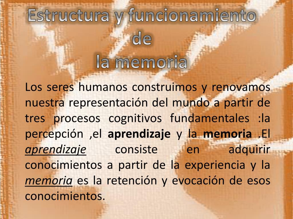 Estructura y funcionamiento de la memoria Los seres humanos construimos y renovamos nuestra representación del mundo a partir de tres procesos cognitivos fundamentales :la percepción ,el aprendizaje y la memoria .El aprendizaje consiste en adquirir conocimientos a partir de la experiencia y la memoria es la retención y evocación de esos conocimientos. • .